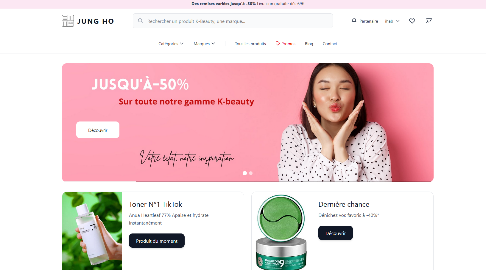 Site K-beauty avec IA de recommandation de produits grâce à la détection d'imperfections du visage.